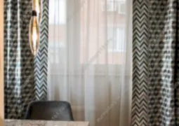 Кухня с акцентными Пинап Шторы с активным геометрическим рисунко. В этом проекте интнресно сочетание различной геометрии в одном полотне штор.