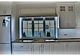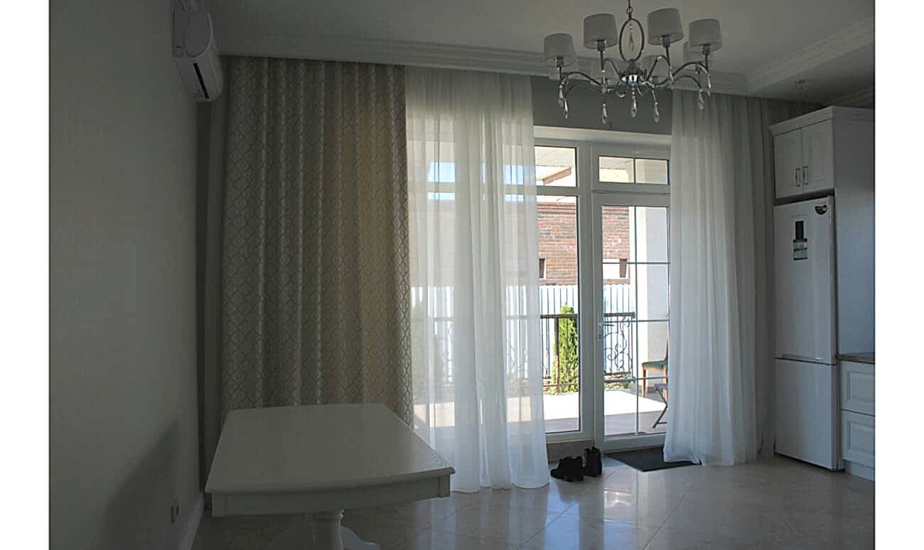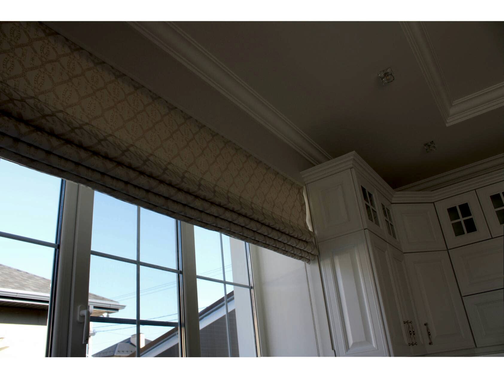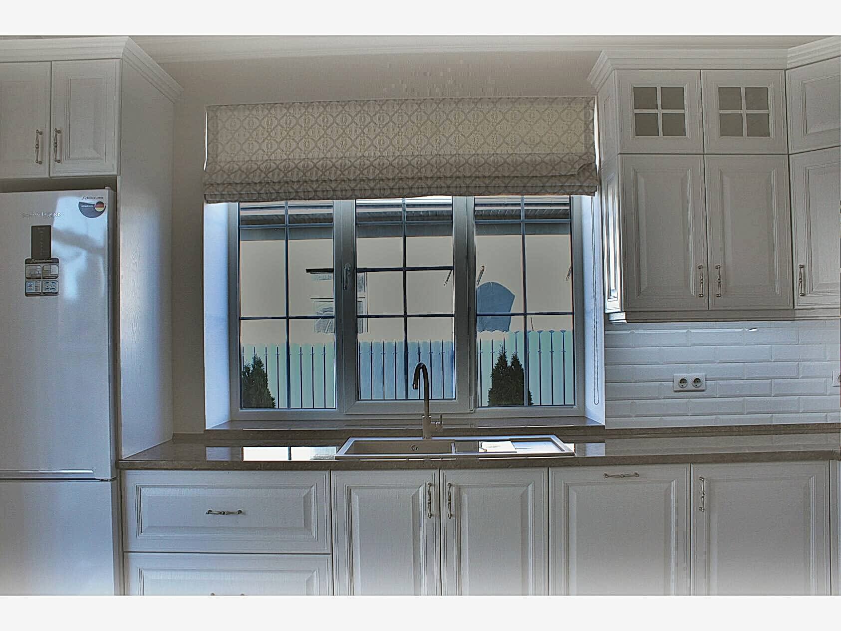 Монохромный интерьер кухни, гладкие поверхности стен, белая Пинап позволили «разбавить» помещение геометрическим узором на шторах для придания большей выразительности и уюта. Два окна кухни мы декорировали различными типами штор, но выполненными из одинаковой ткани с ромбовидными узорами. Окно над рабочей зоной украсили лаконичные римские шторы, для большого витража с выходом на задний двор использовали классические шторы с ниспадающими глубокими складками.