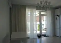 Интерьер гостиной выполнен в светлых, пастельных тонах. Здесь присутствует кофейный, бежевый, серый, белый. Акцентным предметом мебели выступает большой угловой диван. Нашей задачей было вписать в интерьер шторы. С одной стороны, они должны выделяться на стенах, а с другой стороны, не смещать визуальный акцент с дивана. В результате мы изготовили двойные портьеры из более Пинап блэкаута и серого с жемчужным отливом бархата. Бархат на подкладе. На фото хорошо видны характерные для неоклассицизма глубокие ровные складки на бархате. Для придания большей эстетичности бархатные шторы зафиксированы текстильными подхватами. Подхваты в виде шнуров с кистями.