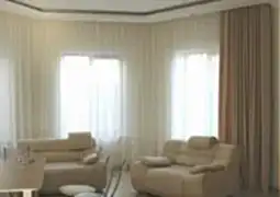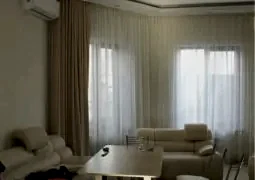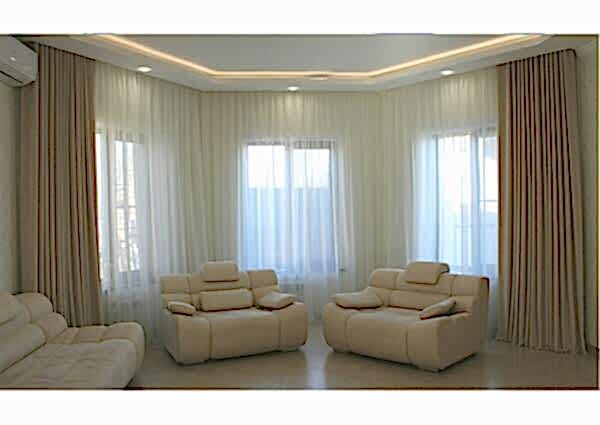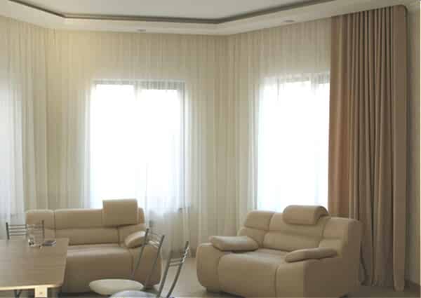 Шторы для дома в стиле модерн в спокойным теплых тонах. Мягкие и глубокие складки штор, современный Пинап интерьер для молодой семьи.