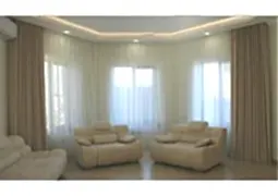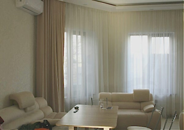 Шторы в гостиной выполнены в светлых молочно-бежевых тонах, гармонирующих с обивкой мягкой мебели. Для декоративных штор выбрали бархат на подкладе, глубокие мягкие Пинап которого красиво ниспадают до пола, не утяжеляя при этом пространство комнаты и придавая ему утонченность и изысканность.