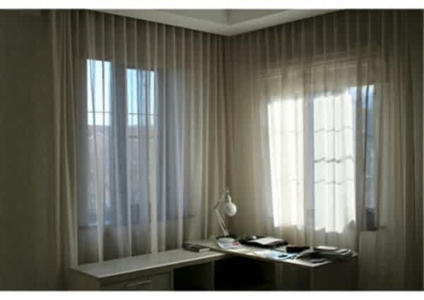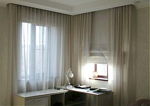 Интерьер комнаты подростка также в светлых тонах. Здесь присутствуют белый, жемчужно-серый цвета. Два окна комнаты мы декорировали римскими шторами из блэкаута, а по бокам гардинами из сетки, что придало интерьеру современный молодёжный вид. Римские шторы очень функциональны, не занимают много места и отлично защищают от яркого света. При подъёме полотна классические римские шторы образуют ровные складки, накладывающиеся друг на друга. Гардины из тюля сетки придают интерьеру современный легкий и Пинап вид.
