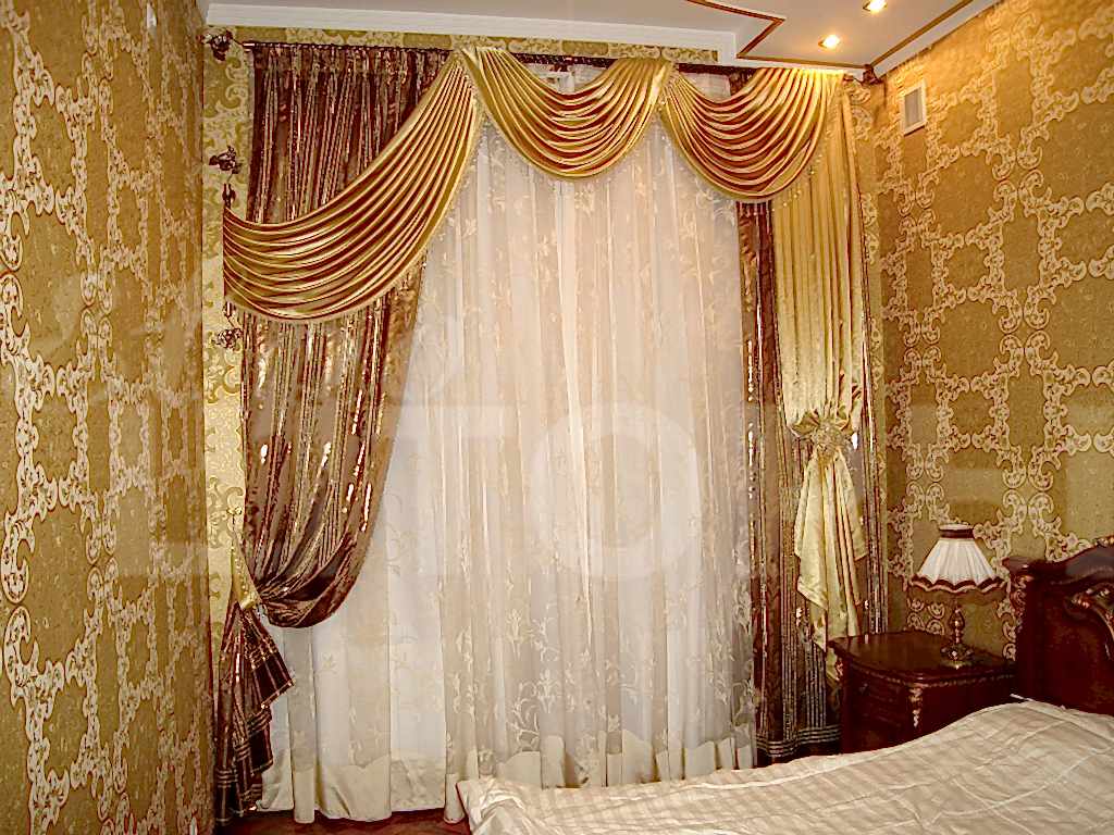 Сложный ламбрекен шьется из нескольких видов материала и может включать Пинап элементы, выстраивающиеся в единую композицию. Также сложный ламбрекен способен включать в себя твердый элемент.